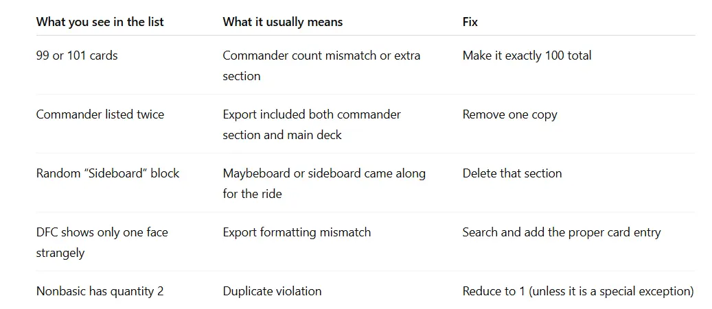 The most common fail is boring: 99 cards, 101 cards, or your commander accidentally printed twice.